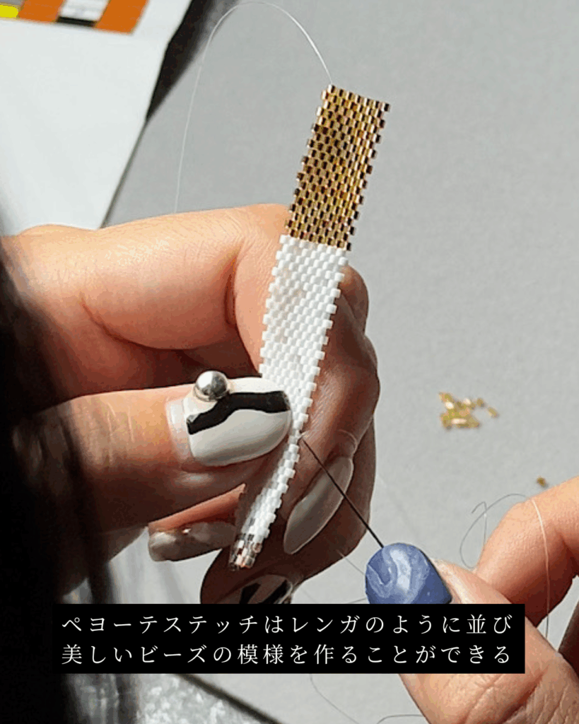 - ペヨーテステッチ:針と糸だけでビーズをレンガ状に編むステッチ技法。オフフルーム(織り機を使わない)技法の代表格です。