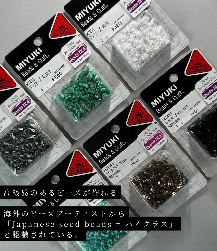 海外のビーズアーティストは「Japanese seed beads = ハイクラス」と認識しているため、信頼性が高く、色やメッキの持ちが非常に良く、高級感のあるビーズジュエリーが作れます。